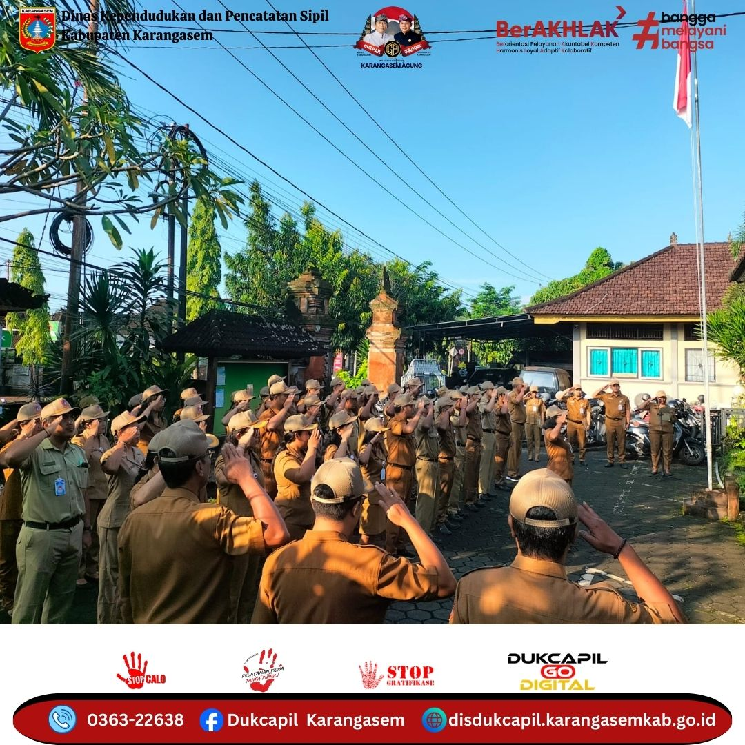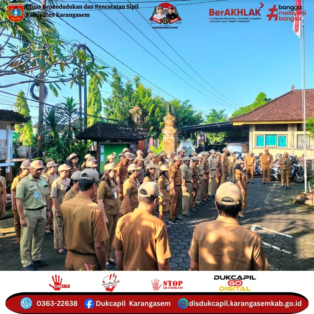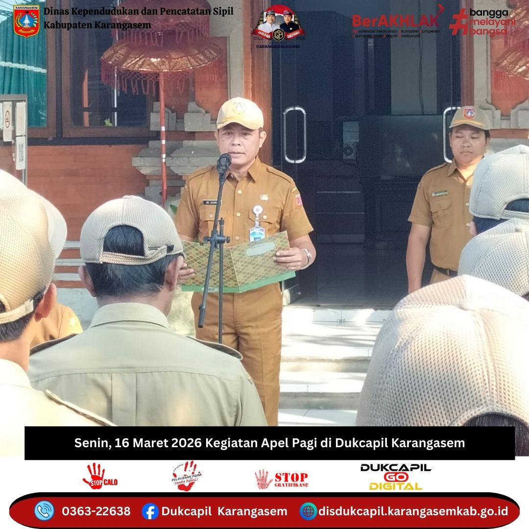 Senin, 16 Maret 2026.Apel Pagi dilaksanakan pada hari ini dengan diikuti oleh seluruh pegawai di lingkungan kantor Disdukcapil Kabupaten Karangasem. Kegiatan apel pagi merupakan salah satu bentuk pembinaan kedisiplinan serta sarana untuk meningkatkan koordinasi, komunikasi, dan tanggung jawab dalam pelaksanaan tugas pelayanan kepada masyarakat.