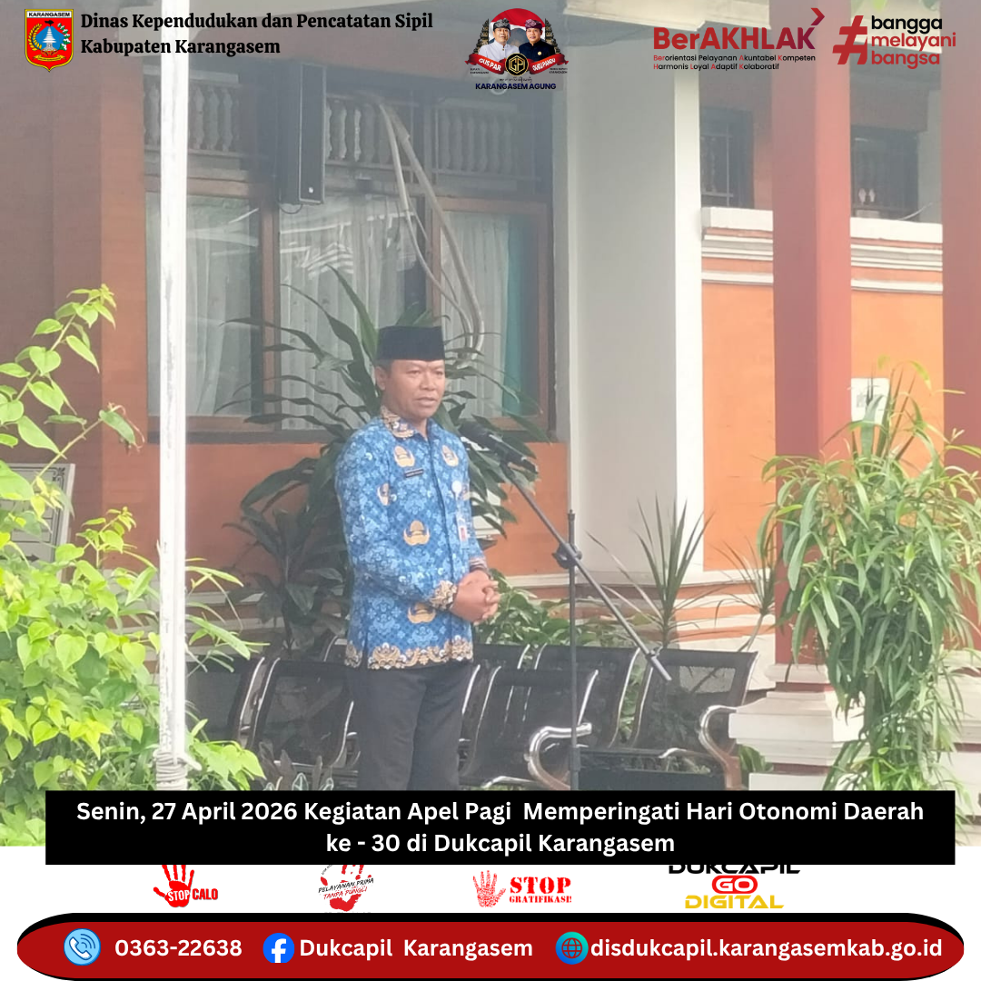 Senin, 27 April 2026, Dinas Kependudukan dan Pencatatan Sipil Kabupaten Karangasem melaksanakan kegiatan Apel Pagi dalam rangka memperingati Hari Otonomi Daerah ke-30 yang dipimpin oleh Bapak Kepala Dinas.