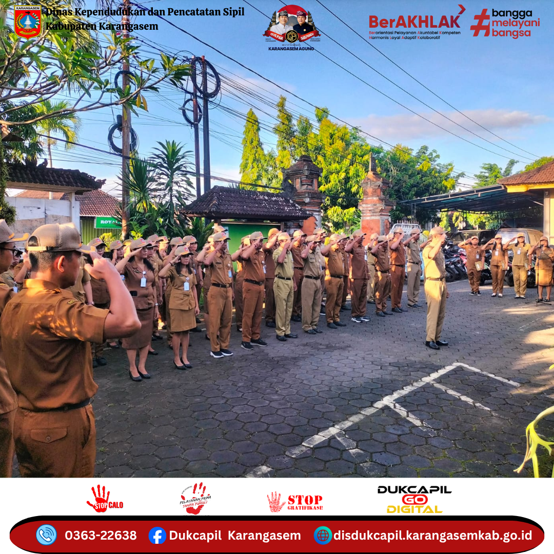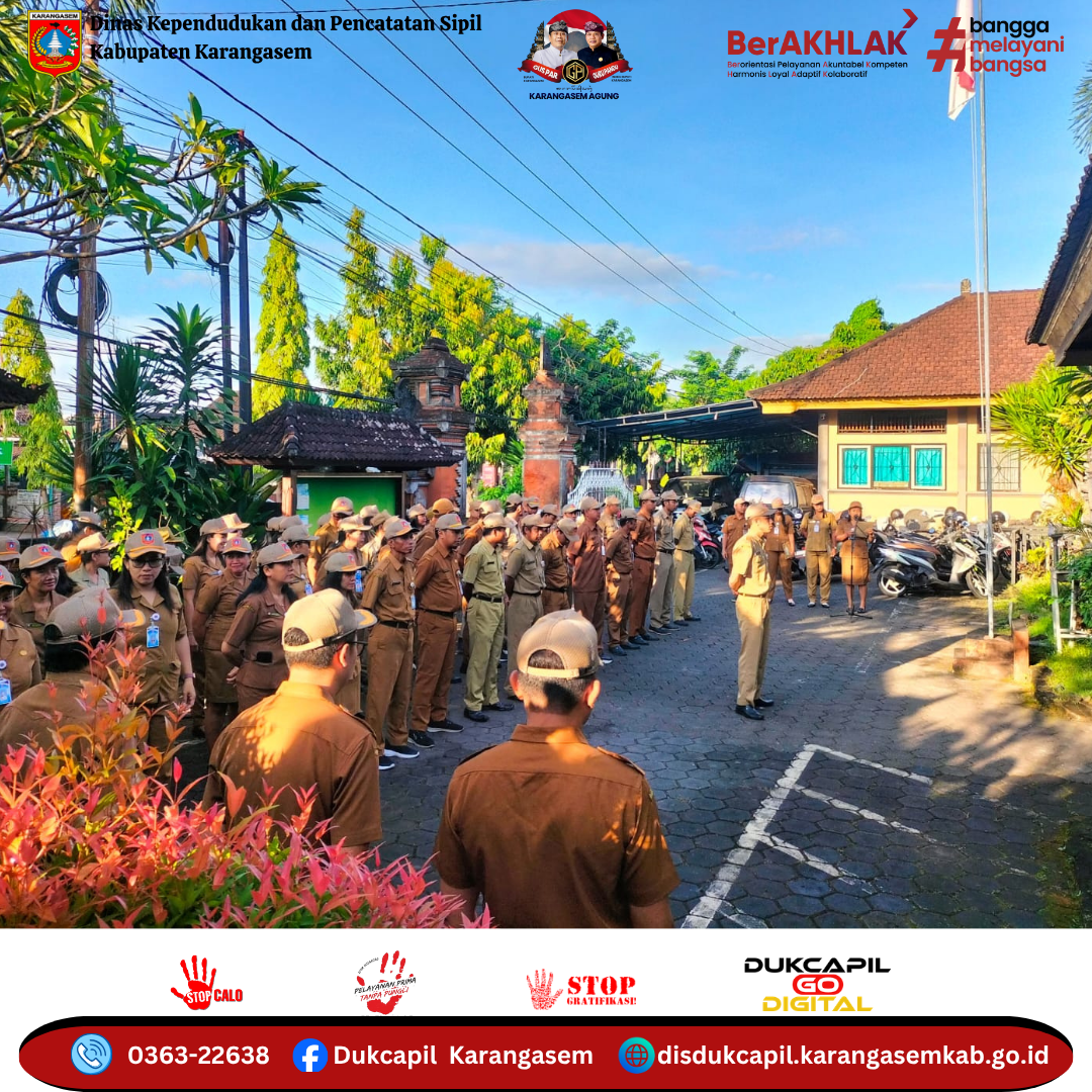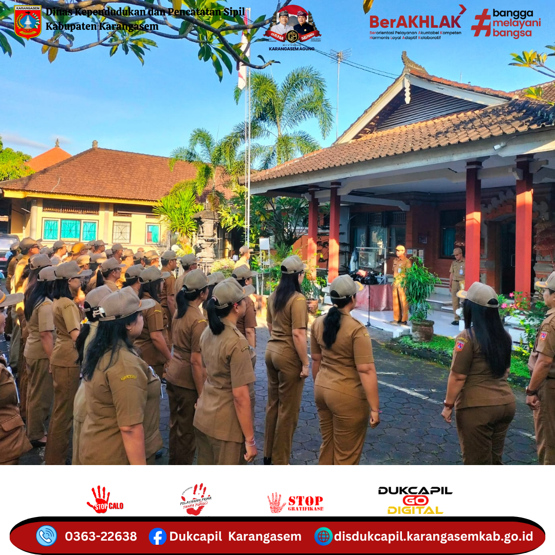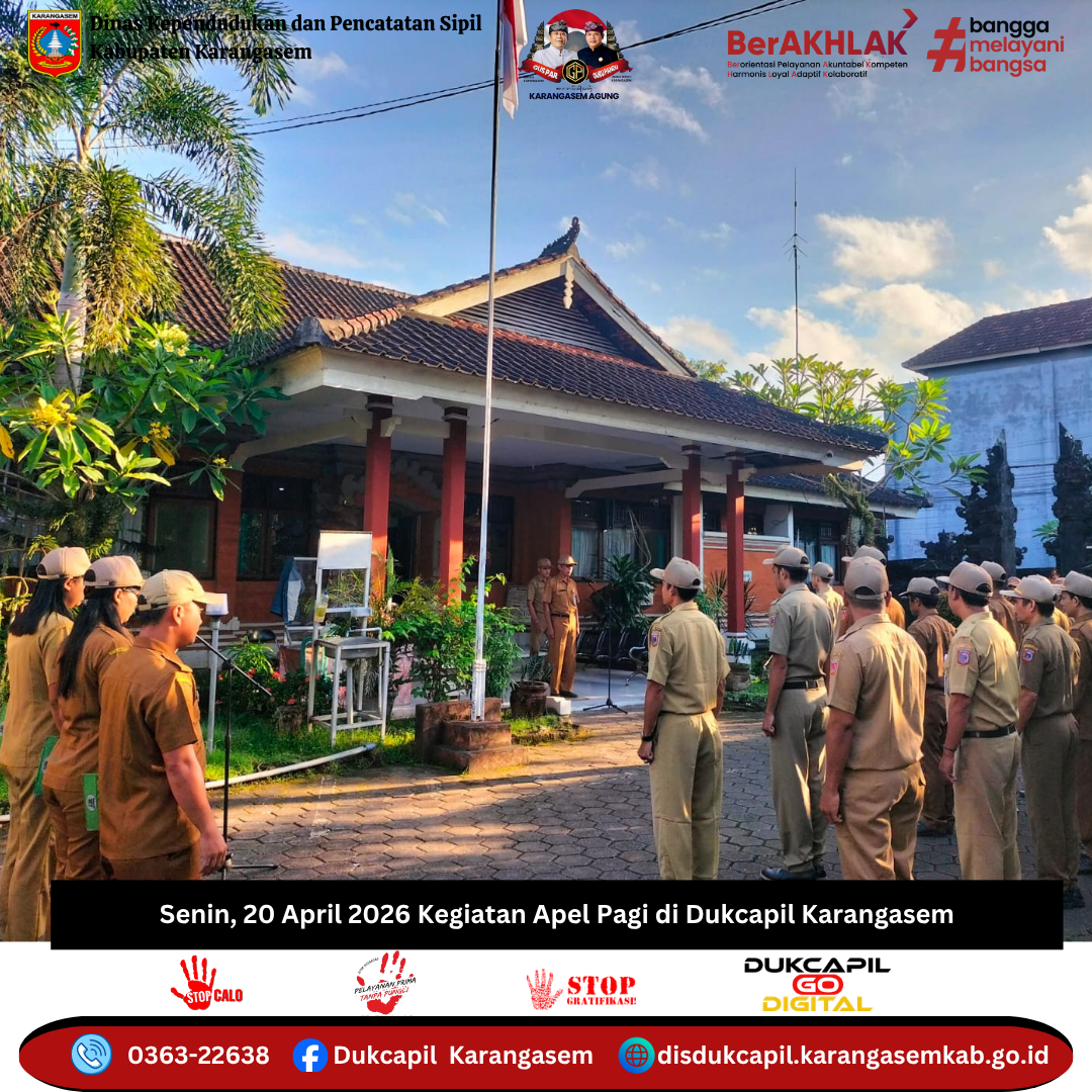 Senin, 20 April 2026, Dinas Kependudukan dan Pencatatan Sipil Kabupaten Karangasem melaksanakan kegiatan apel pagi yang dipimpin oleh Bapak Kepala Bidang Pengelolaan Informasi Administrasi Kependudukan.