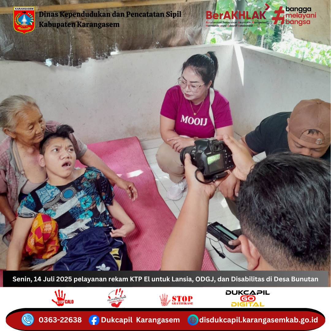 Kamis, 16 April 2026 Pemerintah Kabupaten Karangasem melalui Dinas Kependudukan dan Pencatatan Sipil melaksanakan pelayanan perekaman KTP El bagi Lansia (Lanjut Usia), ODGJ (Orang Dengan Gangguan Jiwa), dan Disabilitas di Desa Seraya Timur, Kecamatan Karangasem.