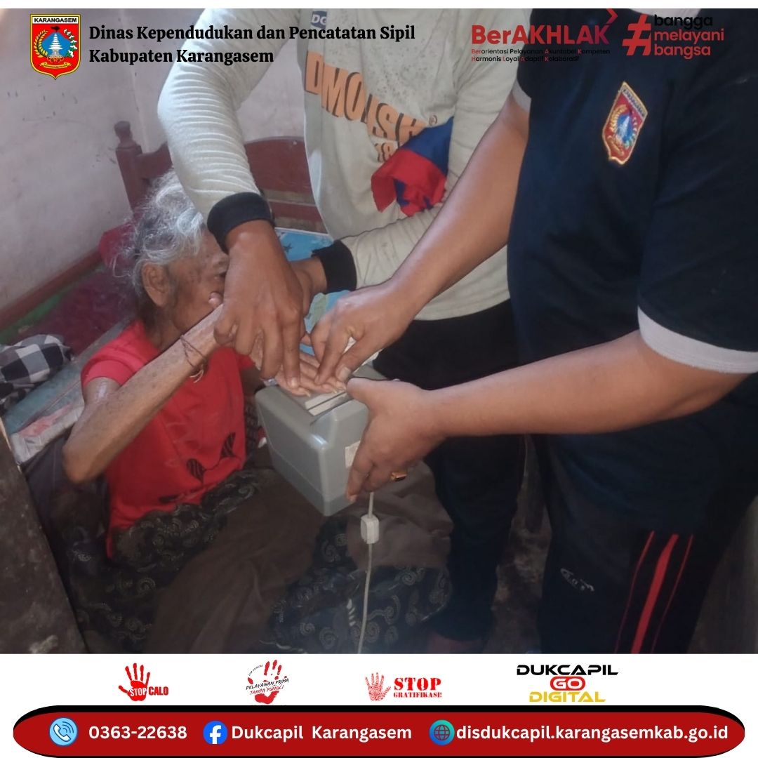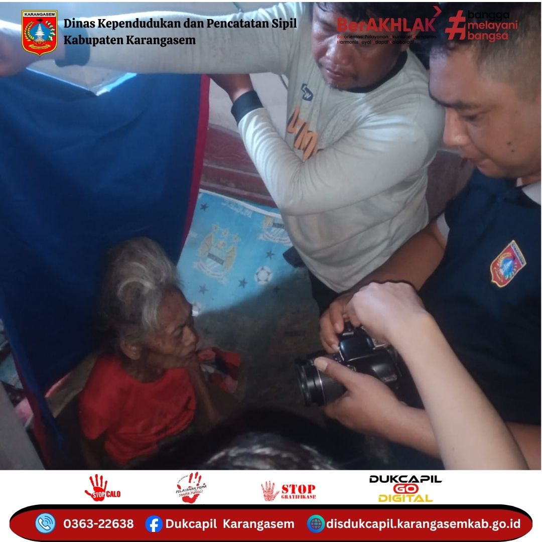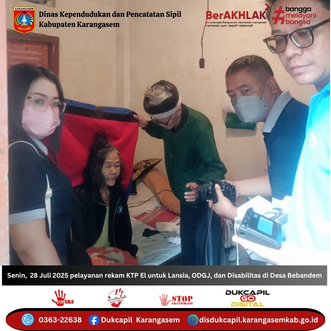 Senin, 28 Juli 2025 Pemerintah Kabupaten Karangasem melalui Dinas Kependudukan dan Pencatatan Sipil melaksanakan pelayanan perekaman KTP El bagi Lansia (Lanjut Usia), ODGJ (Orang Dengan Gangguan Jiwa), dan Disabilitas di Desa Bebandem, Kecamatan Bebandem.