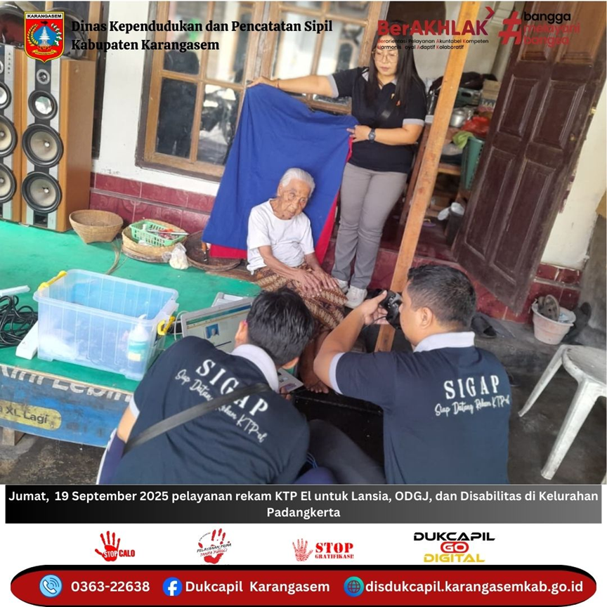 Jumat, 19 September 2025 Pemerintah Kabupaten Karangasem melalui Dinas Kependudukan dan Pencatatan Sipil melaksanakan pelayanan perekaman KTP El bagi Lansia (Lanjut Usia), ODGJ (Orang Dengan Gangguan Jiwa), dan Disabilitas di Kelurahan Padangkerta, Kecamatan Karangasem Kabupaten Karangasem.
