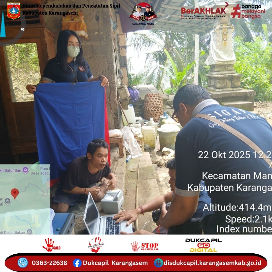 Rabu, 22 Oktober 2025 Pemerintah Kabupaten Karangasem melalui Dinas Kependudukan dan Pencatatan Sipil melaksanakan pelayanan perekaman KTP El bagi Lansia (Lanjut Usia), ODGJ (Orang Dengan Gangguan Jiwa), dan Disabilitas di Desa Ulakan, Kecamatan Manggis, Kabupaten Karangasem.