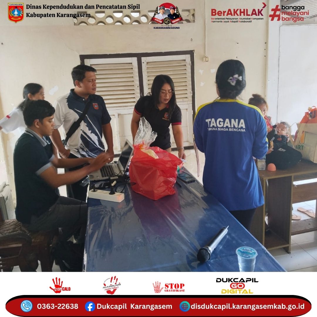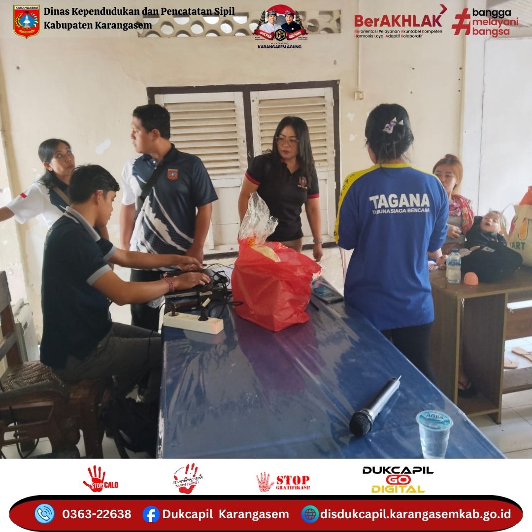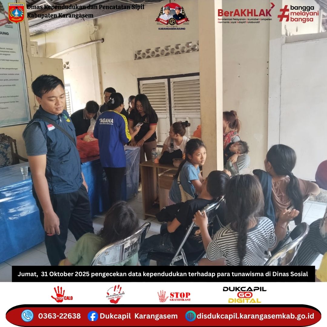Jumat 31 Oktober 2025 Pemerintah Kabupaten Karangasem melalui Dinas Kependudukan dan Pencatatan Sipil melaksanakan pelayanan perekaman KTP El bagi Lansia (Lanjut Usia), ODGJ (Orang Dengan Gangguan Jiwa), dan Disabilitas di Desa Macang, Kecamatan Bebandem, Kabupaten Karangasem. Dilanjutkan dengan pengecekan data kependudukan terhadap para tunawisma di Dinas Sosial.