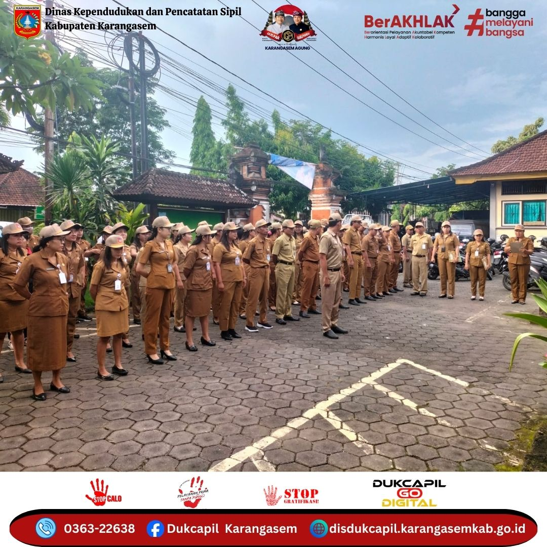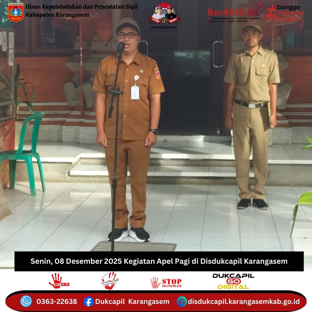 Senin, 08 Desember 2025 Dinas Kependudukan dan Pencatatan Sipil Kabupaten Karangasem melaksanakan Apel Pagi yang dipimpin oleh Kepala Bidang Pemanfaatan Data dan Inovasi Pelayanan.