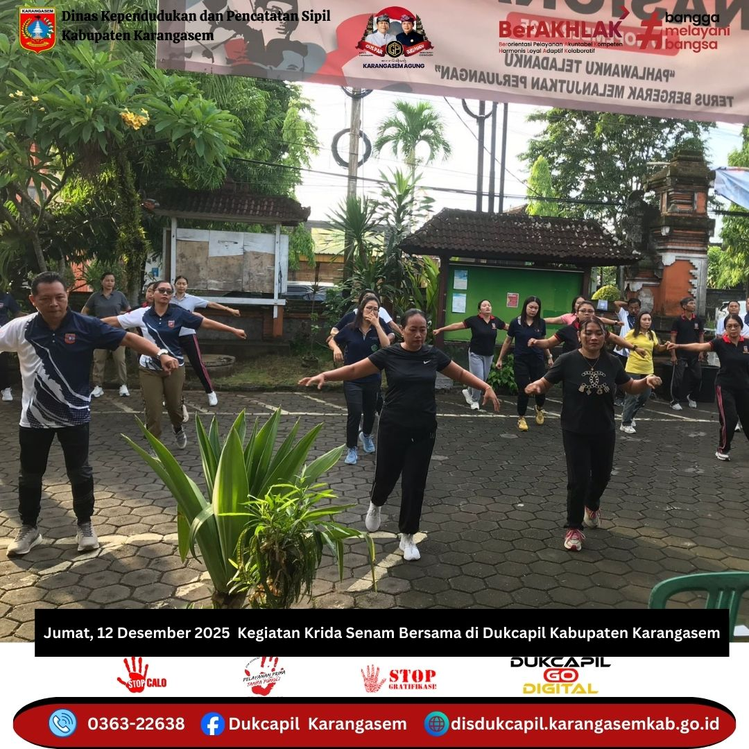 Jumat, 12 Desember 2025 Kegiatan krida diisi dengan senam bersama di Lingkungan Kantor Dinas Kependudukan dan Pencatatan Sipil Kabupaten Karangasem. Kegiatan ini diikuti oleh seluruh pegawai guna meningkatkan kebersamaan dan semangat dalam memberikan pelayanan terbaik untuk masyarakat Kabupaten Karangasem.