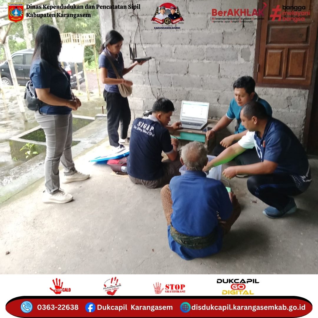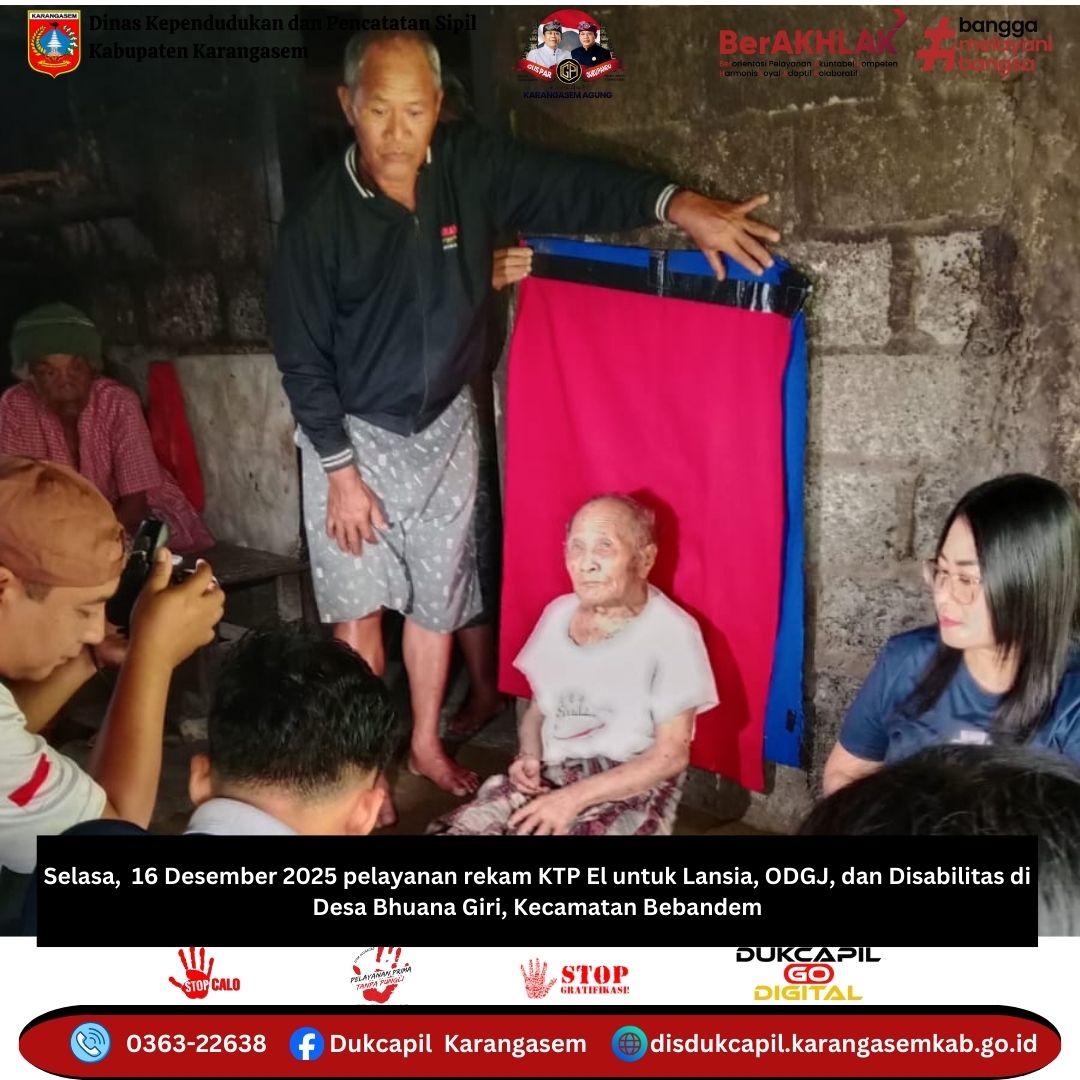Selasa, 16 Desember 2025 Pemerintah Kabupaten Karangasem melalui Dinas Kependudukan dan Pencatatan Sipil melaksanakan pelayanan perekaman KTP El bagi Lansia (Lanjut Usia), ODGJ (Orang Dengan Gangguan Jiwa), dan Disabilitas di Desa Bhuana Giri, Kecamatan Bebandem.