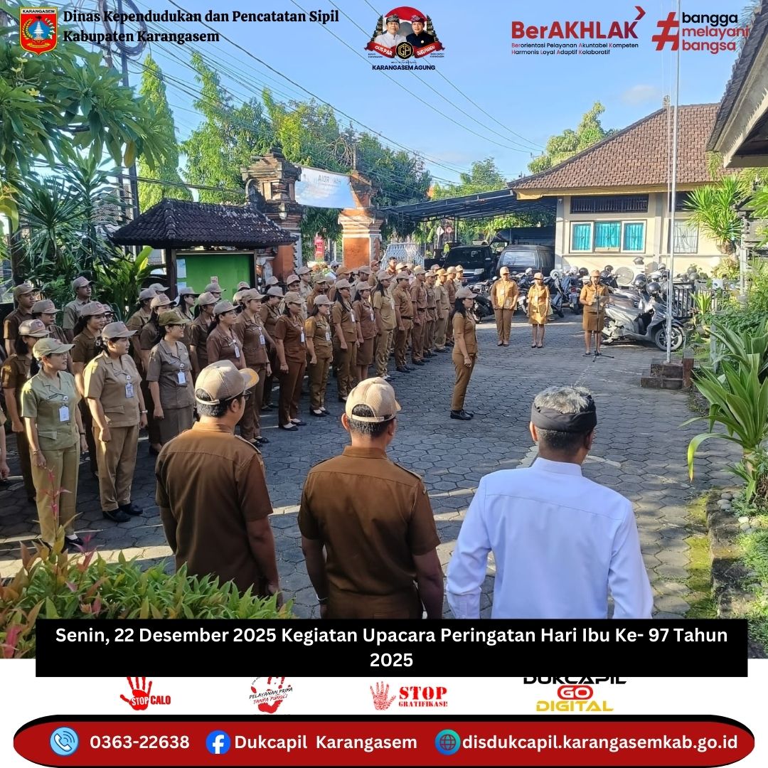 Dinas Kependudukan dan Pencatatan Sipil Kabupaten Karangasem melaksanakan Upacara Peringatan Hari Ibu yang Ke- 97 Tahun 2025, Selamat Hari Ibu untuk seluruh perempuan di Indonesia, mari kita lanjutkan komitmen bersama untuk memperkuat peran perempuan dalam pembangunan nasional demi terwujudnya Indonesia yang lebih maju, inklusif, dan berkeadlian.