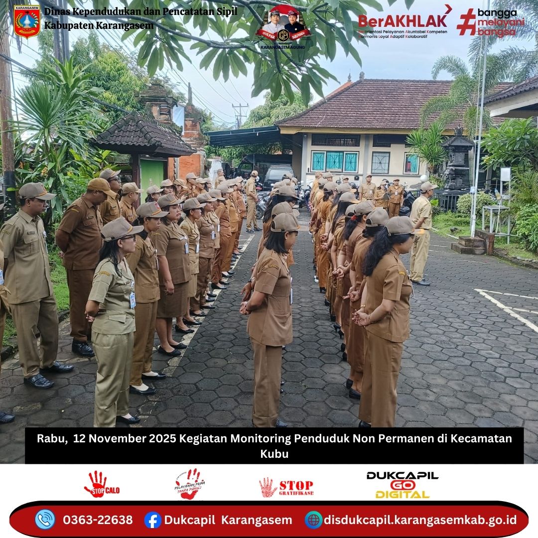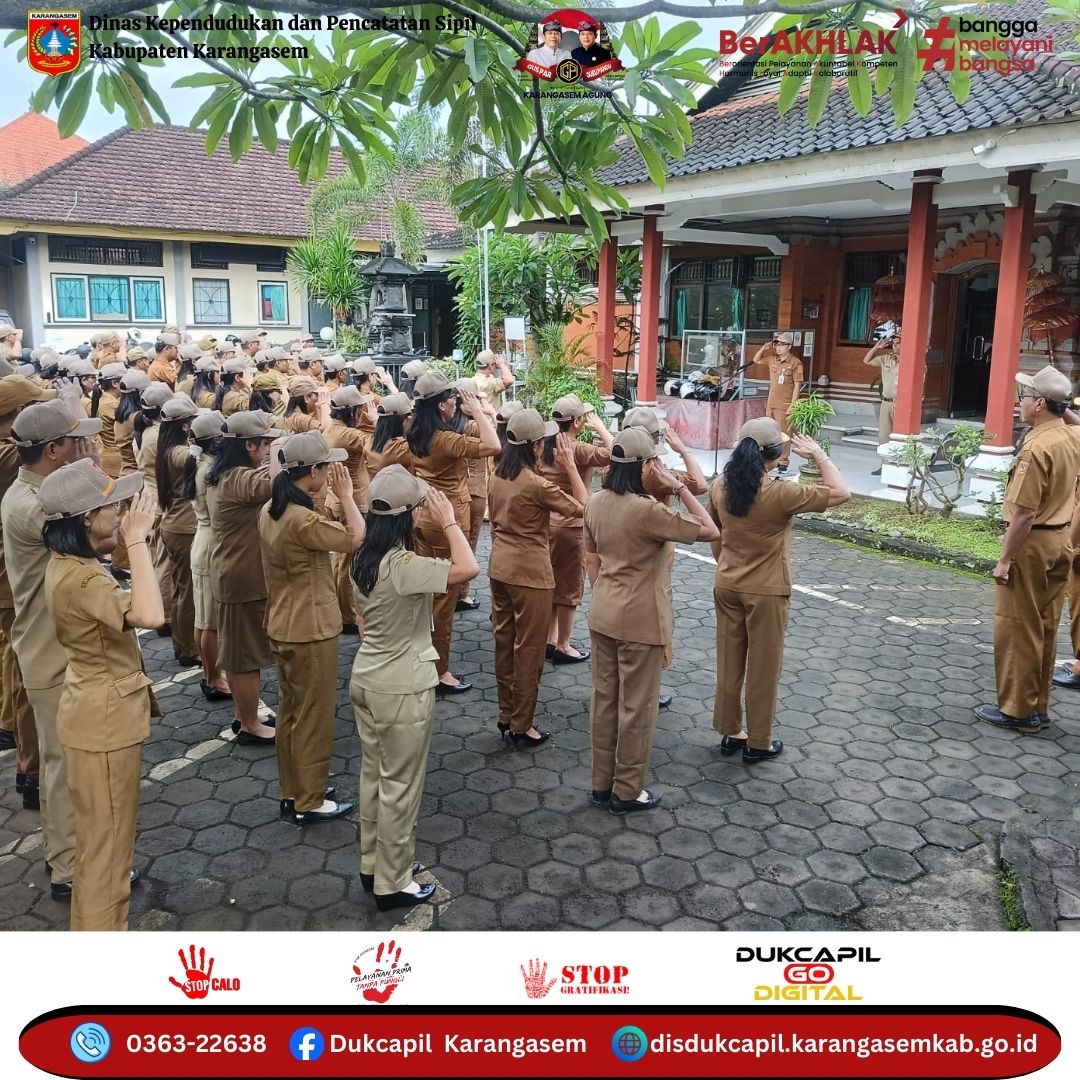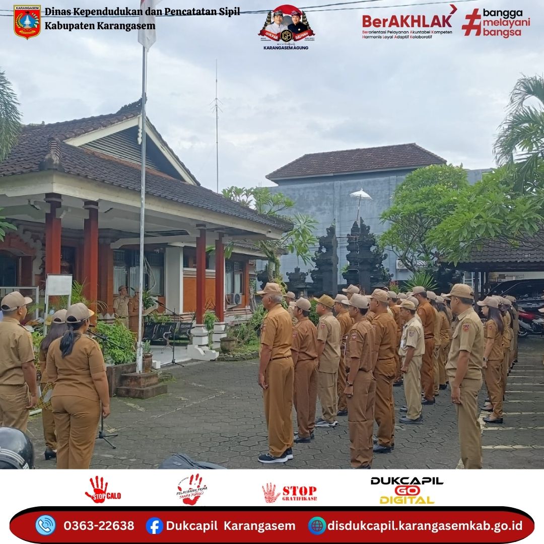 Dinas Kependudukan dan Pencatatan Sipil Kabupaten Karangasem melaksanakan Apel Pagi yang dipimpin oleh Kepala Bidang Pemanfaatan Data dan Inovasi Pelayanan.