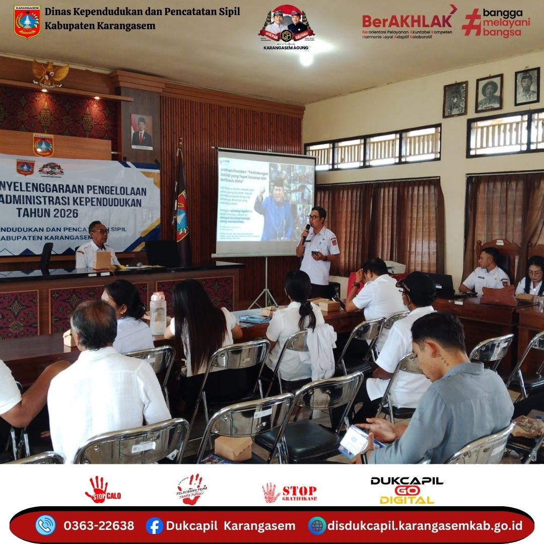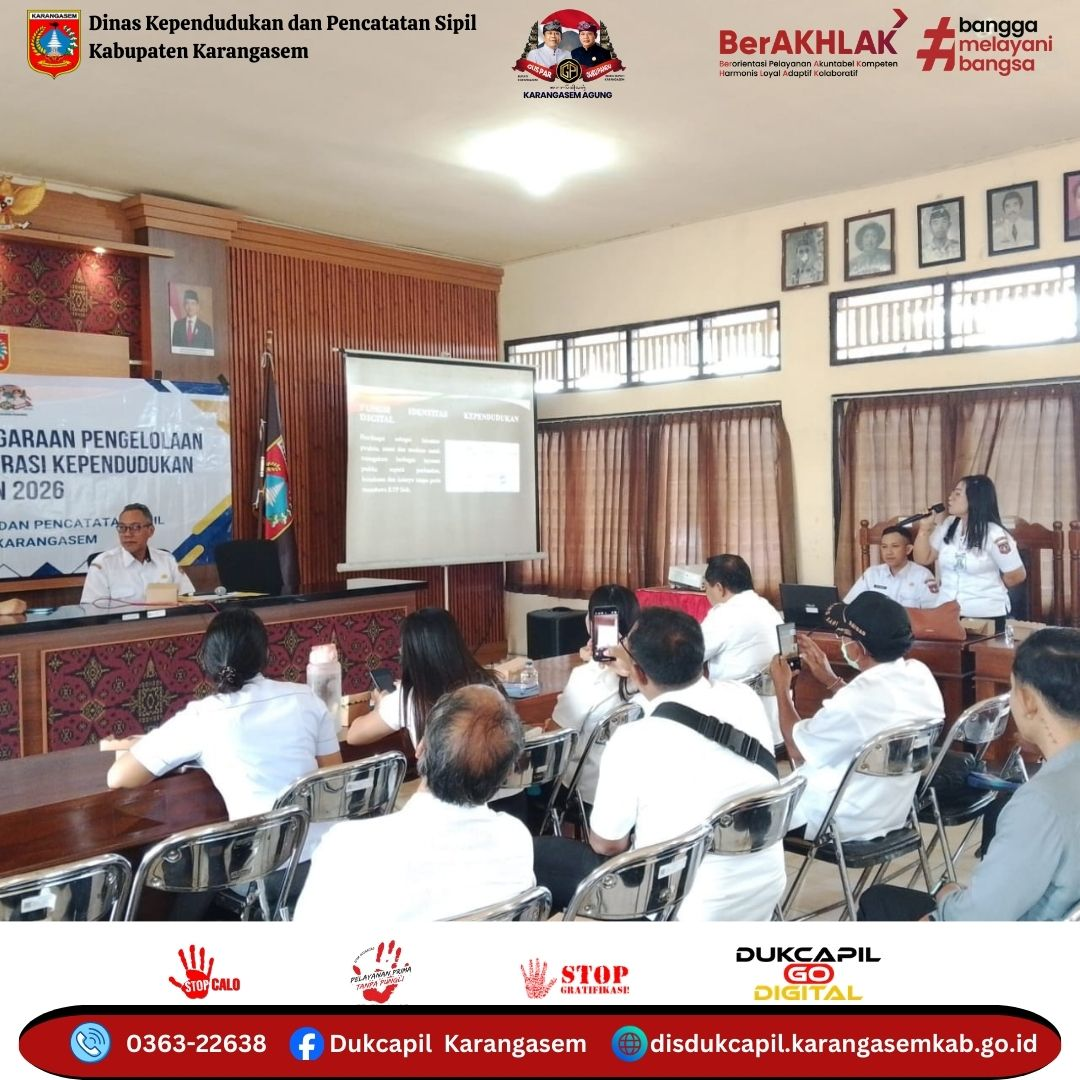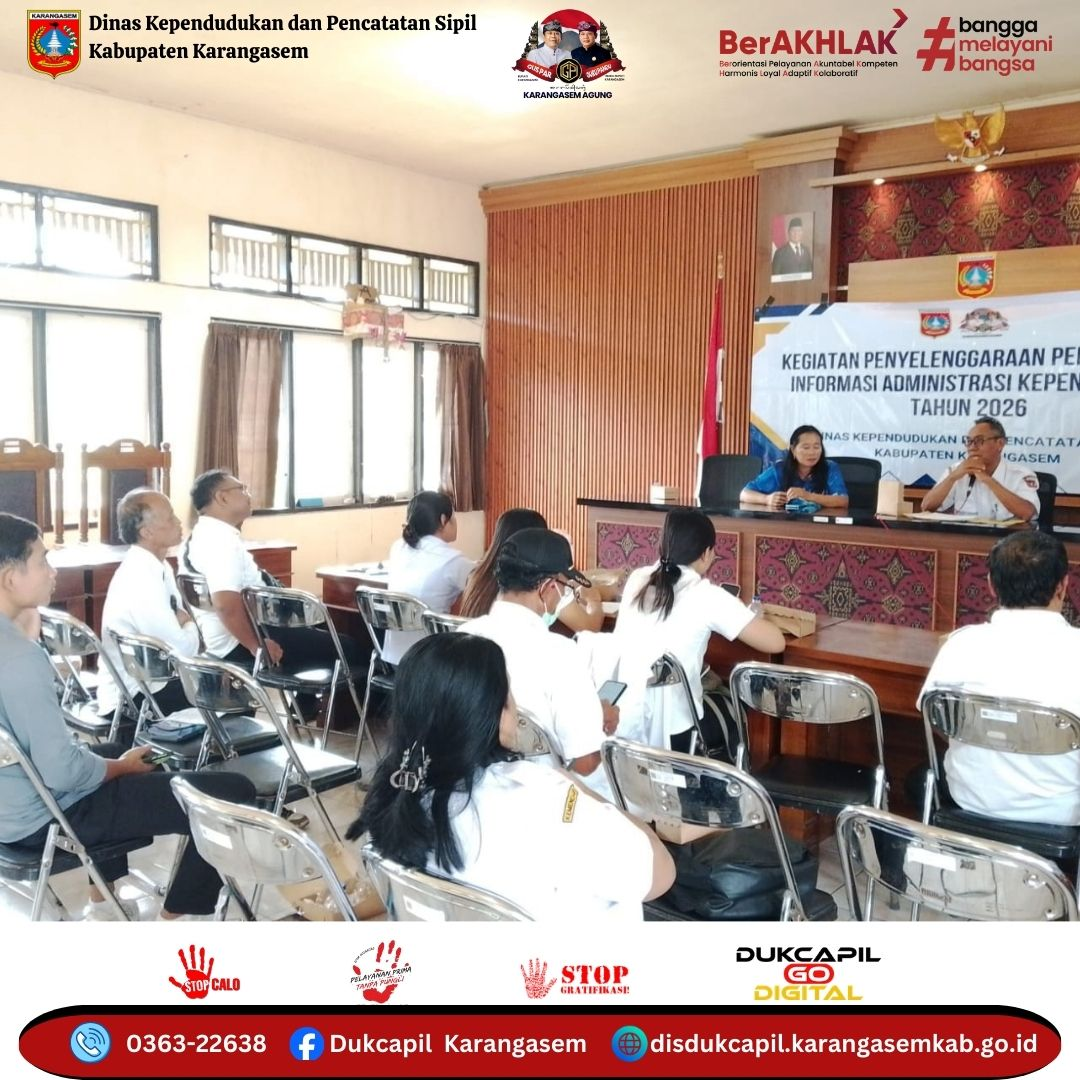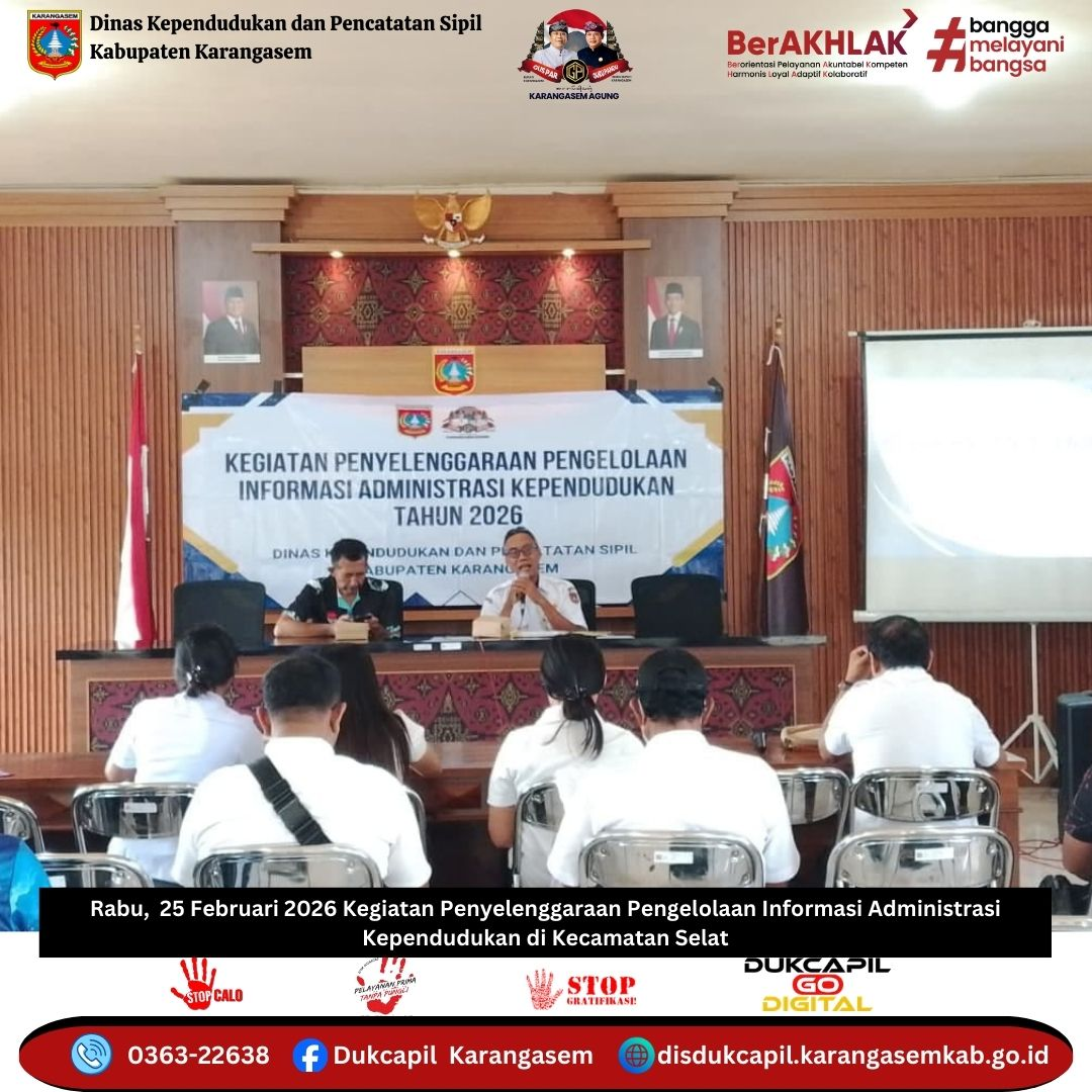 Dinas Kependudukan dan Pencatatan Sipil Kabupaten Karangasem melaksanakan Kegiatan Penyelenggaraan Pengelolaan Informasi Administrasi Kependudukan pada Rabu, 25 Februari 2026, yang bertempat di Aula Kayana Graha Kantor Camat Selat.