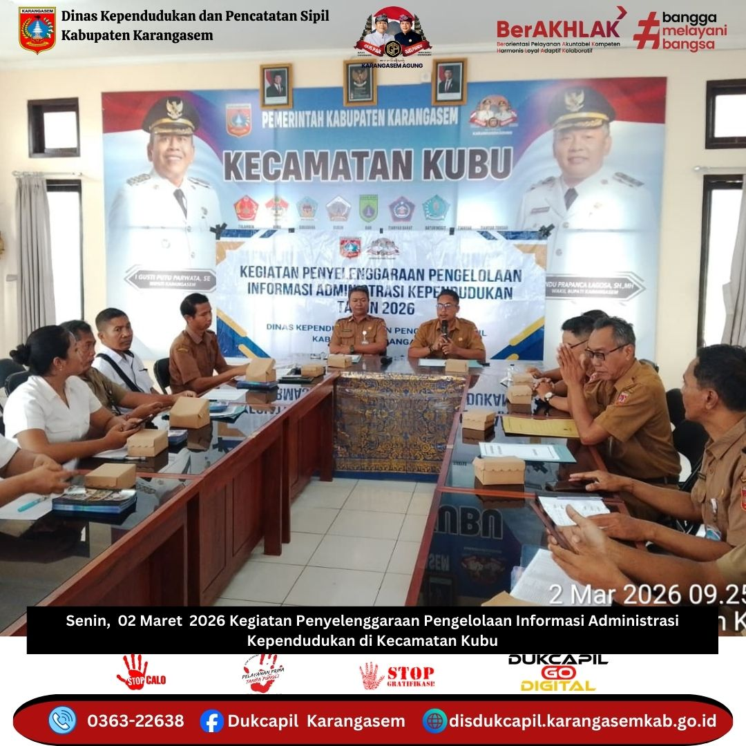 Dinas Kependudukan dan Pencatatan Sipil Kabupaten Karangasem melaksanakan Kegiatan Penyelenggaraan Pengelolaan Informasi Administrasi Kependudukan pada Senin, 02 Maret 2026, yang bertempat di Aula Kantor Kecamatan Kubu.