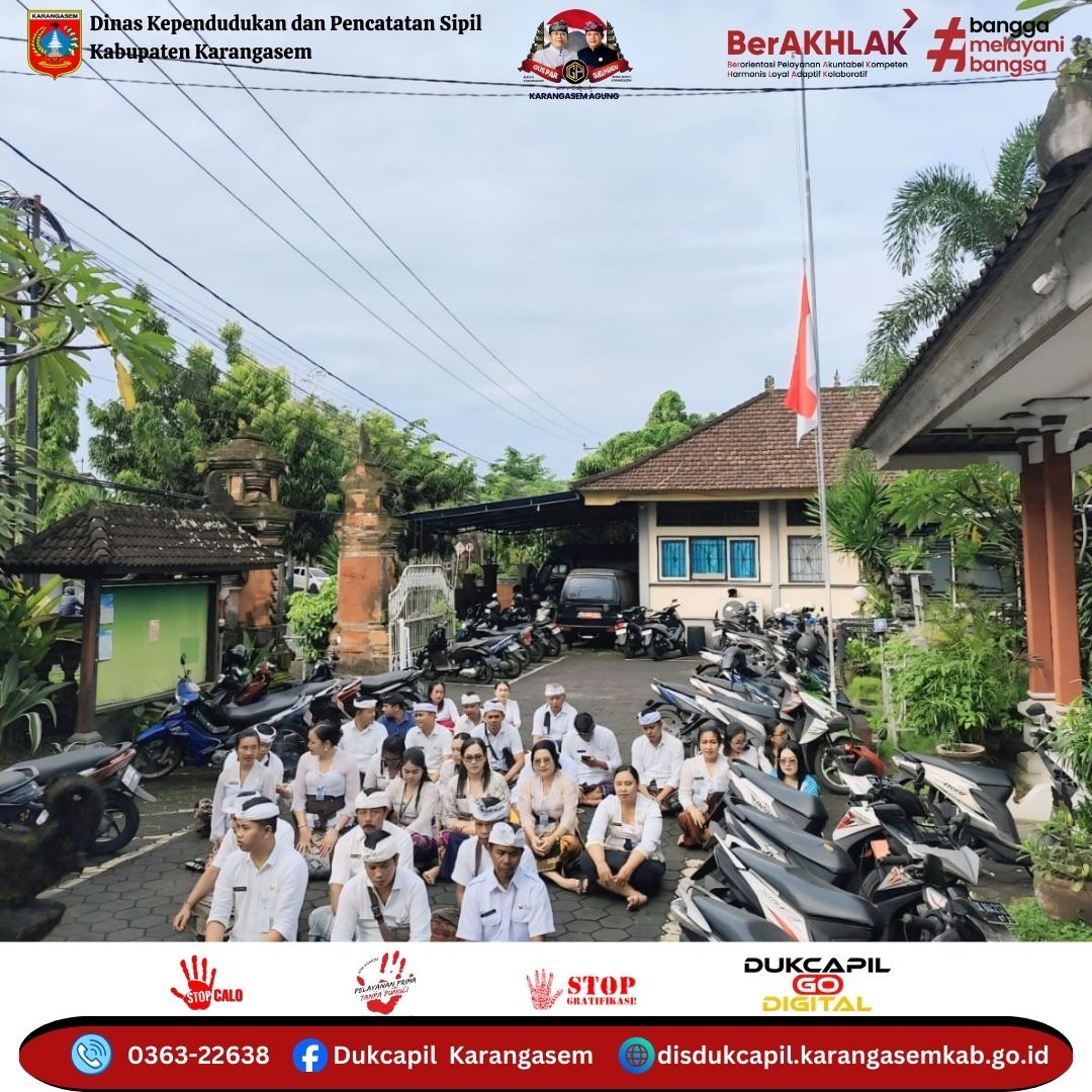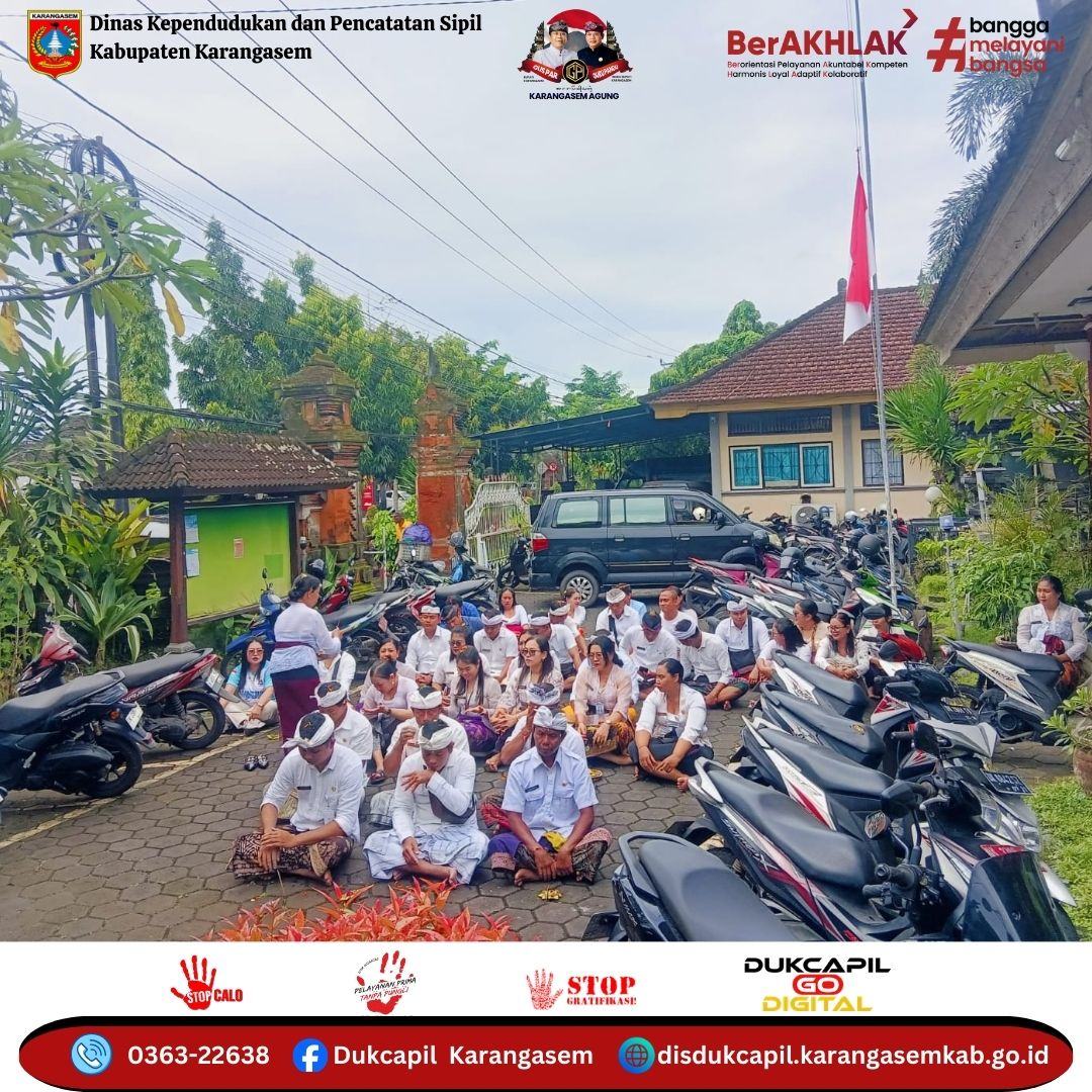 Dengan suasana khidmat dan penuh ketulusan, seluruh pegawai memanjatkan doa agar senantiasa diberikan kesehatan, keselamatan, serta kelancaran dalam melaksanakan tugas dan tanggung jawab pelayanan kepada masyarakat. Semoga melalui persembahyangan ini, Dinas Kependudukan dan Pencatatan Sipil Kabupaten Karangasem semakin solid, profesional, dan mampu memberikan pelayanan yang prima, akurat, serta membahagiakan masyarakat.