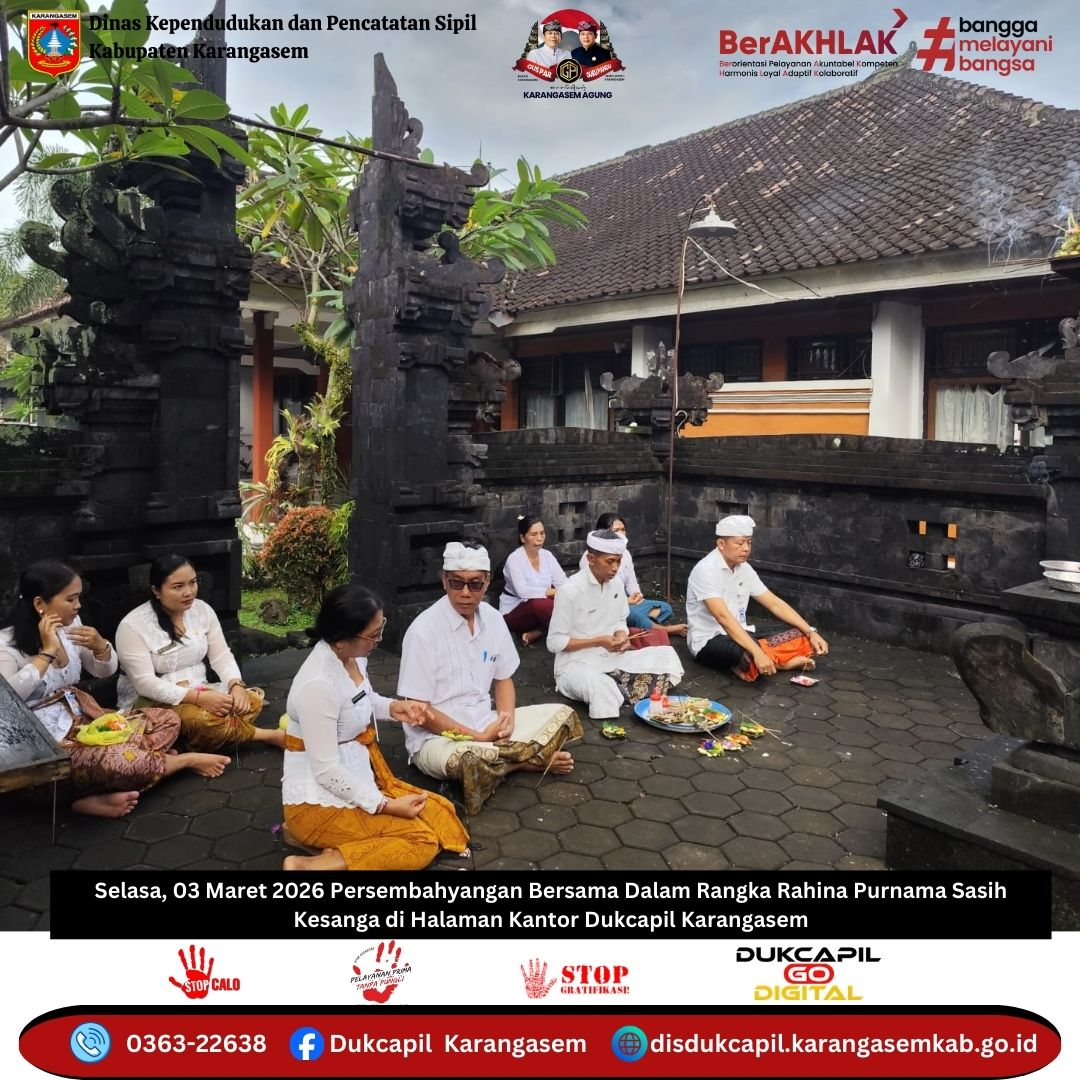 Dalam rangka memperingati Rahina Purnama Sasih Kesanga, Dinas Kependudukan dan Pencatatan Sipil Kabupaten Karangasem melaksanakan persembahyangan bersama di Padmasana kantor pada hari yang penuh kesucian ini. Kegiatan persembahyangan diikuti oleh Bapak Sekretaris Dinas beserta seluruh pegawai sebagai wujud bhakti dan rasa syukur ke hadapan Ida Sang Hyang Widhi Wasa.
