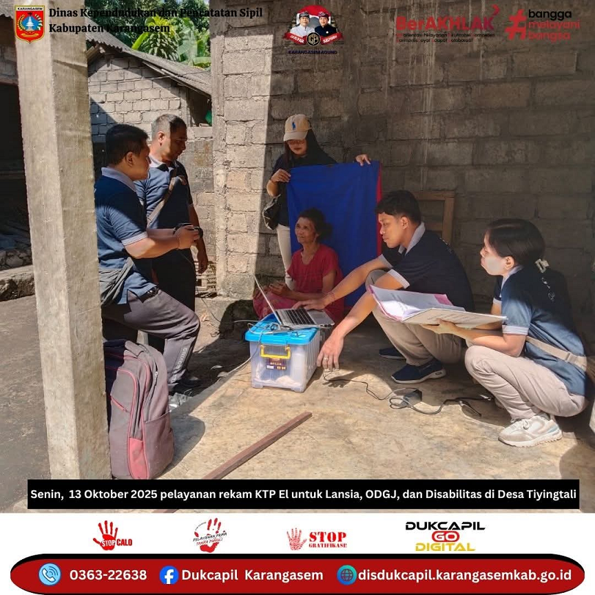 Senin, 13 Oktober 2025 Pemerintah Kabupaten Karangasem melalui Dinas Kependudukan dan Pencatatan Sipil melaksanakan pelayanan perekaman KTP El bagi Lansia (Lanjut Usia), ODGJ (Orang Dengan Gangguan Jiwa), dan Disabilitas di Desa Tiyingtali, Kecamatan Abang, Kabupaten Karangasem.